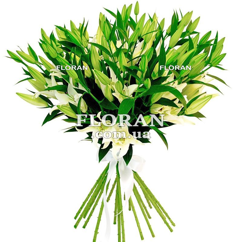 Букет лілій – код товару FL-351. Букет з 19 білих лілій - це справжня вишуканість та витонченість у кожній квітці. Білі лілії символізують чистоту, ніжність та шляхетність. Вони користуються величезною популярністю як подарунок на весілля, ювілеї та інші урочисті заходи.