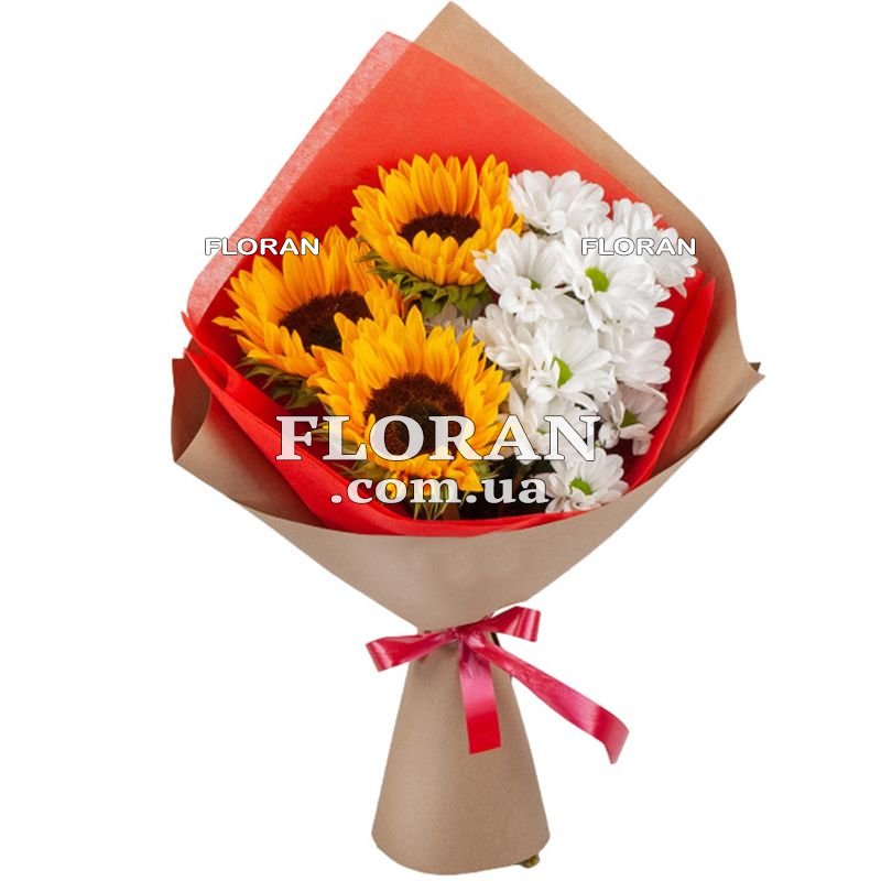 3 соняшники, 4 білі хризантеми, упаковка