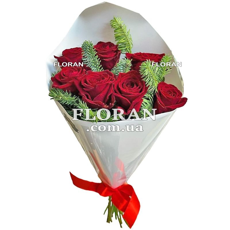 Букет на Різдво - код товару FL-619. Цей новорічний букет стане чудовим подарунком для близьких та друзів. Він складається з 7 червоних троянд, які символізують любов і пристрасть, а також гілок ялини чи сосни, які додають до композиції з троянд новорічного настрою. Червоний колір троянд ідеально поєднується із зеленню ялинки або сосни, створюючи яскравий образ, що запам'ятовується. Гілки ялинки або сосни надають букету особливої атмосфери та запаху свята. Букет на новий рік буде чудовою прикрасою для будь-якого будинку чи офісу. Композиція з троянд та гілок ялини чи сосни виглядає дуже елегантно та стильно. 7 червоних троянд у цьому букеті додають нотку романтики та пристрасті. Якщо ви хочете порадувати своїх близьких та друзів напередодні Різдва, цей букет стане ідеальним вибором. Він підійде як для жінок, так і для чоловіків, і стане чудовим символом вашої любові та турботи.