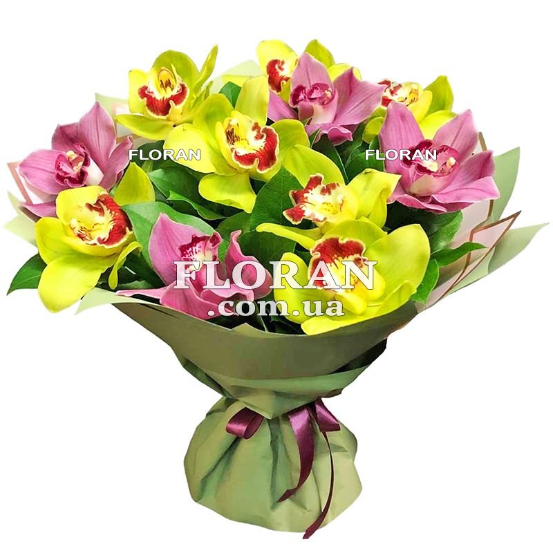 11 різнокольорових орхідей, зелень, упаковка