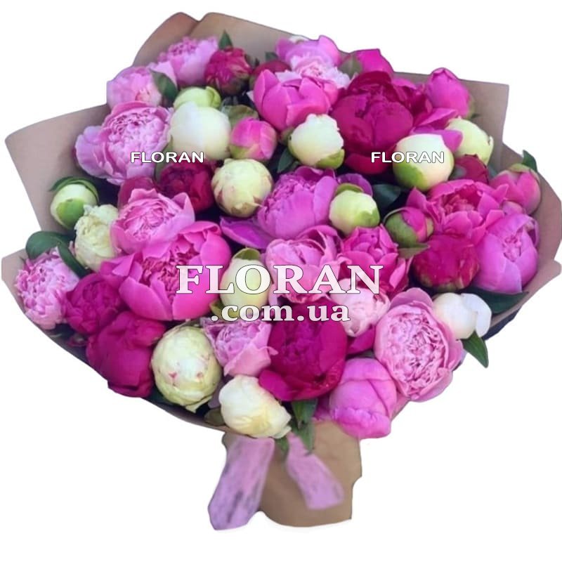 Букет півоній мамі - код товару FL-970. Букет з 49 різнокольорових місцевих півоній - прекрасний подарунок для вашої мами. Місцеві півонії володіють особливим шармом і красою, які привнесуть в букет неповторну атмосферу. Різнокольорові півонії в букеті будуть яскравим і радісним проявом природи. Кожна півонія має своє унікальне забарвлення, від яскравих червоних і рожевих до ніжних білих і жовтих відтінків. Це створює прекрасне поєднання кольорів, яке символізує різноманітність і красу життя.
