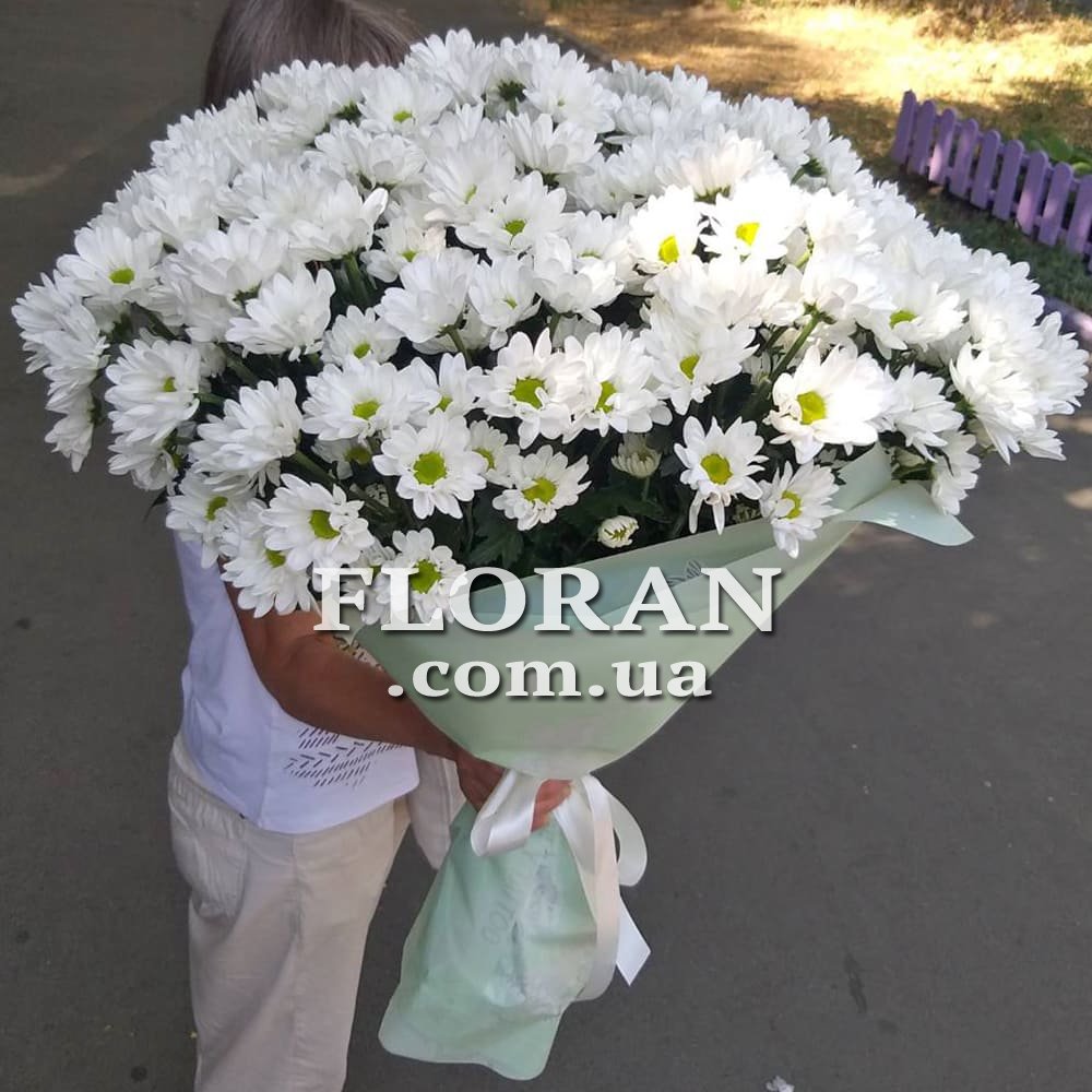 Букет з 25 білих кущових хризантем виглядає чудово та ефектно. Його пишні та повні квітки створюють вражаючий об'єм та текстуру, які привертають погляди та радують очі. Такий букет може стати чудовим подарунком для дорогої людини, друга чи колеги, висловлюючи при цьому почуття радості, подяки чи поздоровлення.