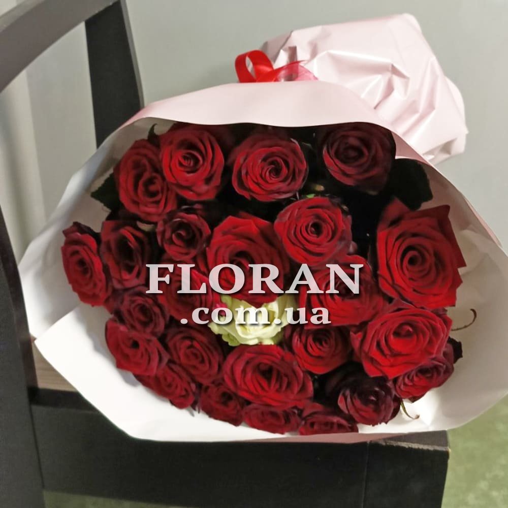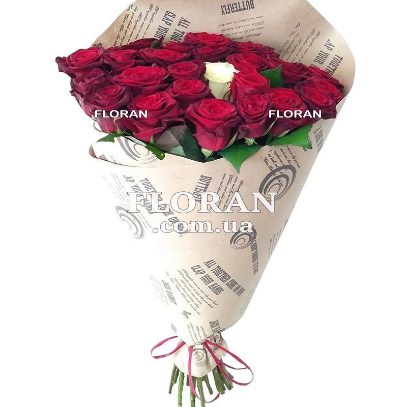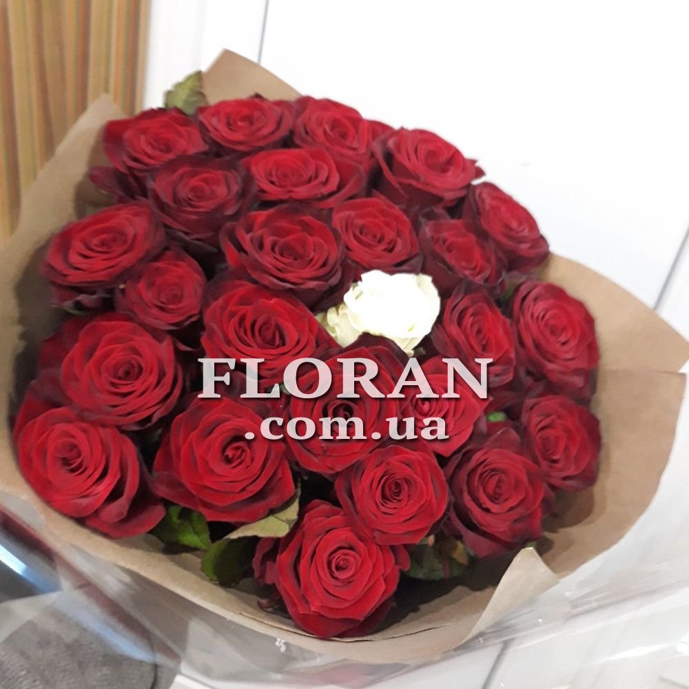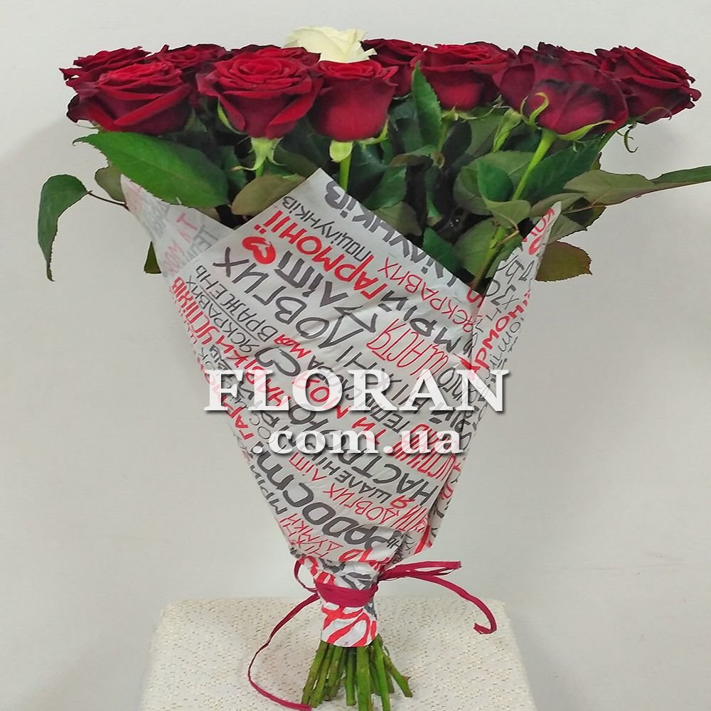 Букет роз дівчині - код товару FL-670. Червоні троянди – символ пристрасті, кохання та романтики, а біла троянда – символ чистоти та невинності. Такий склад букета – ідеальний вибір для подарунка дівчині. 24 червоні троянди в букеті можуть уособлювати 24 години на день, які любов і пристрасть наповнюють, а біла троянда в центрі символізує дівчину, яка є центром уваги та турботи. Такий букет висловить ваші почуття та покаже вашу відданість та любов до вашої дівчини. Цей букет також може стати чудовим подарунком на День Народження, День Святого Валентина або інший особливий день, коли ви хочете висловити свої почуття.