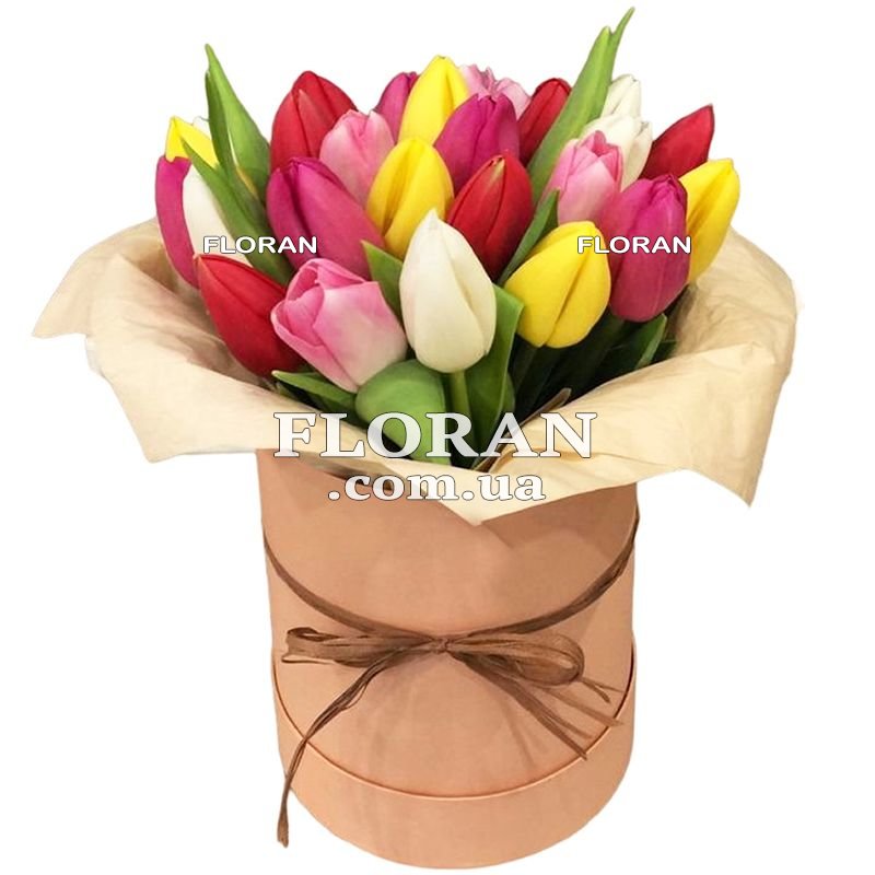 25 різнокольорових тюльпанів, коробка