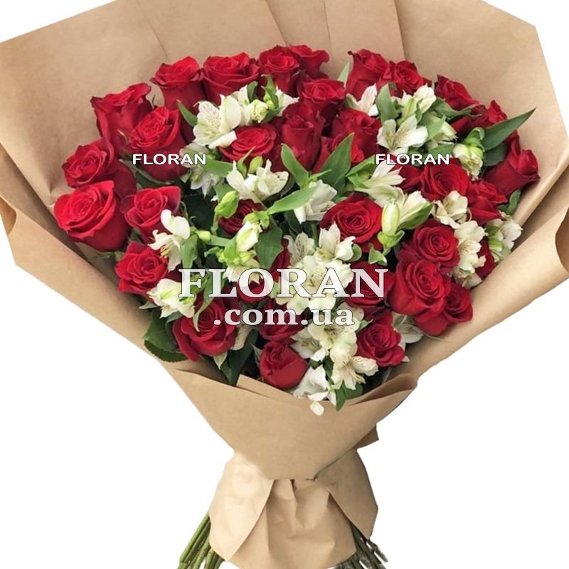 35 червоних троянд, 10 білих альстромерій, упаковка