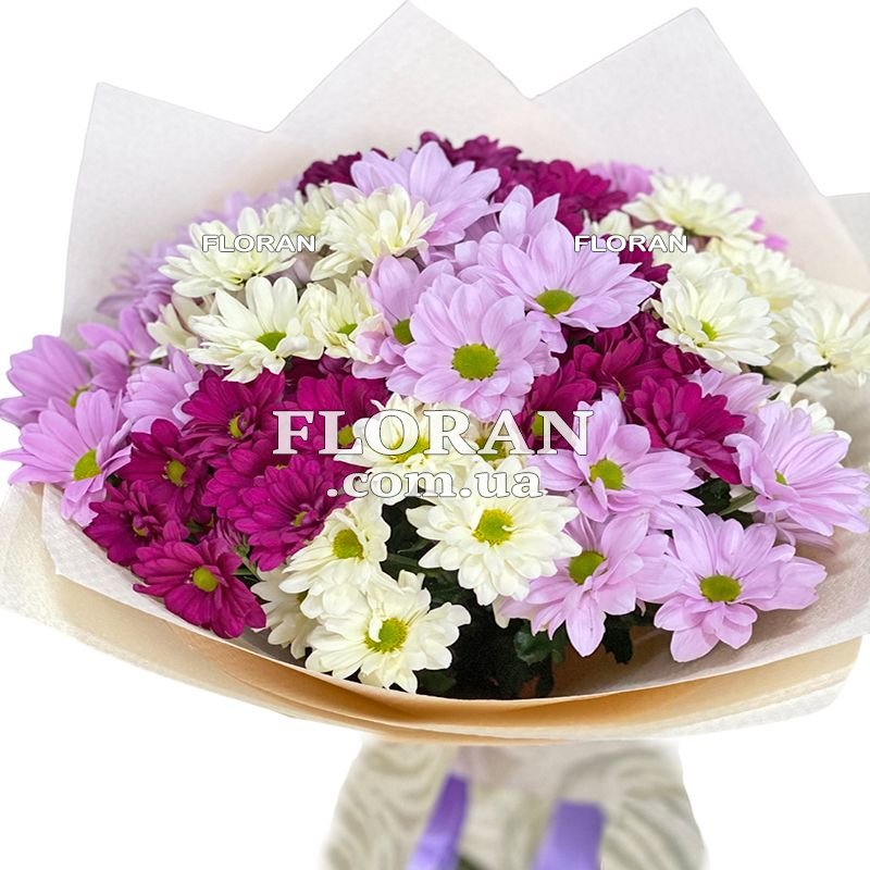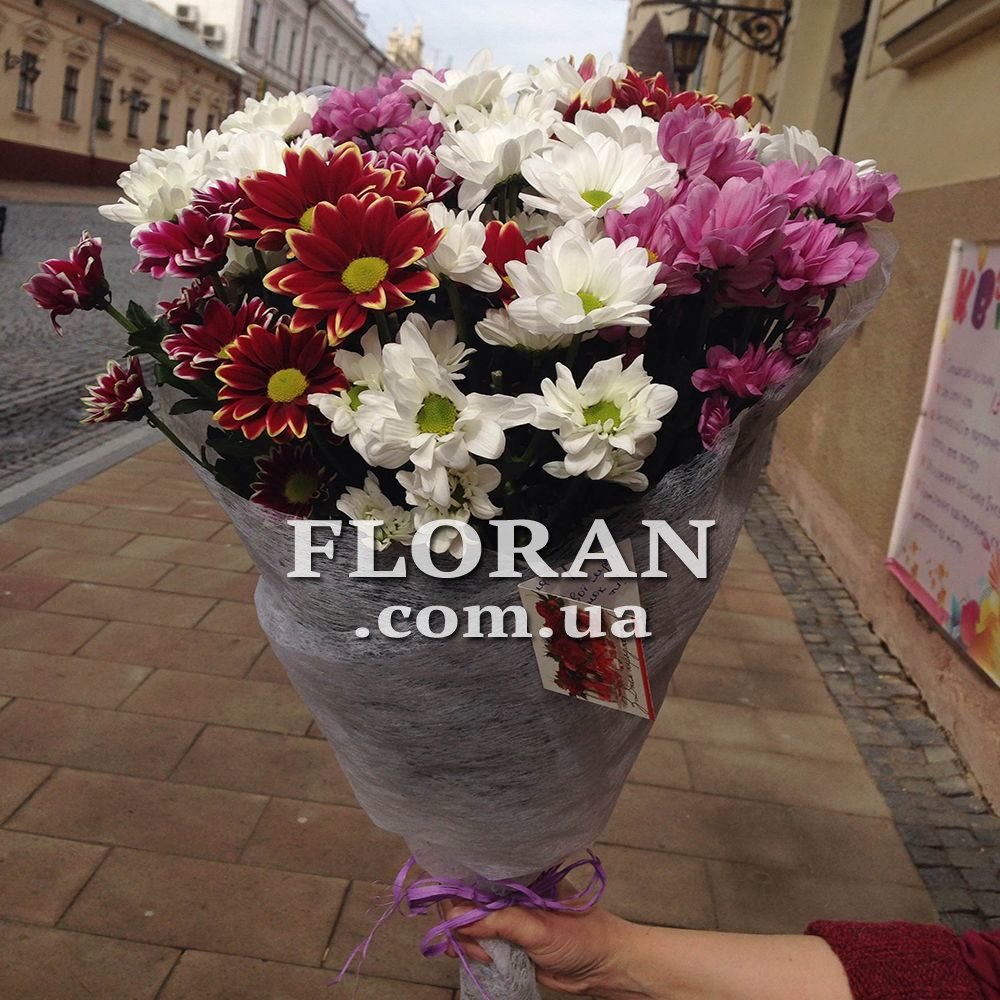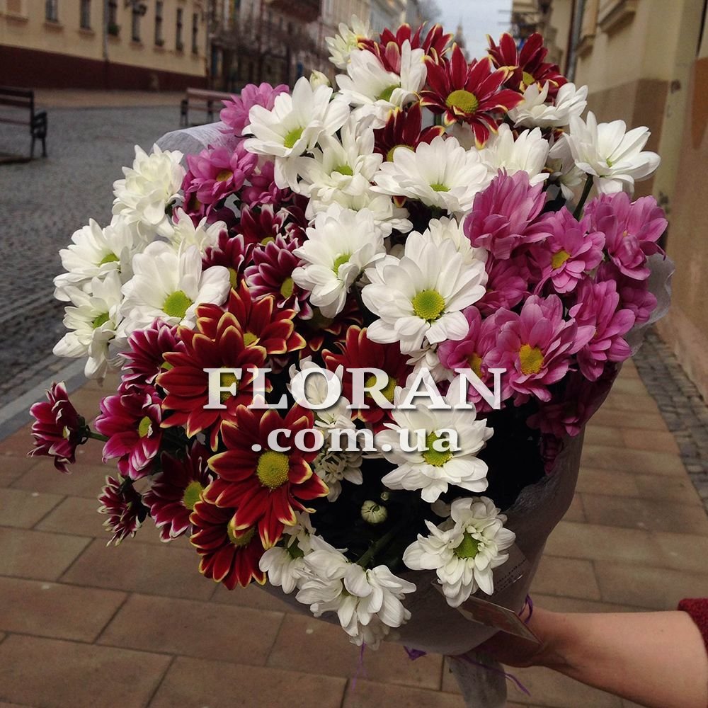 Букет з 11 хризантем - код товару FL-329. Букет із 11 різнокольорових хризантем – це яскравий та оригінальний подарунок, який підійде для будь-якого випадку. Кожна квітка має свій унікальний відтінок, що робить букет неймовірно барвистим та привабливим. Такий букет можна подарувати як знак уваги до близької людини, як символ побажання щастя та удачі в житті. Він також може бути чудовим комплементом до основного подарунка або використаний як основний подарунок.