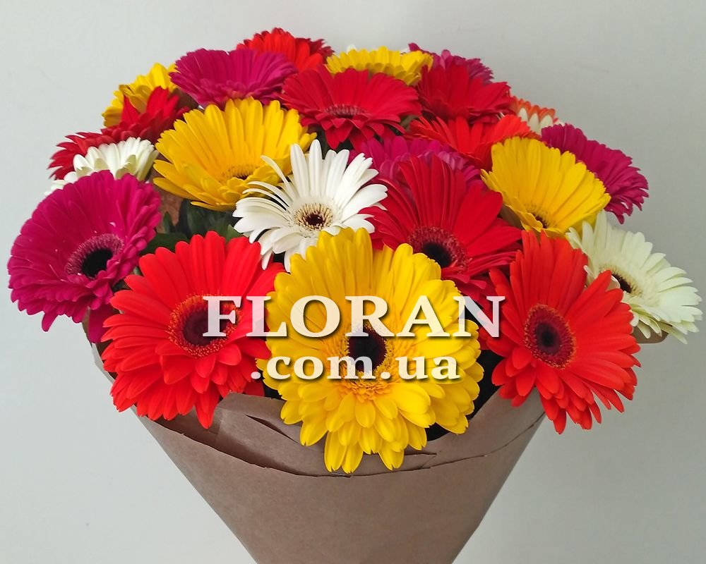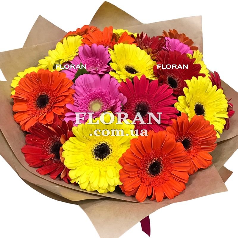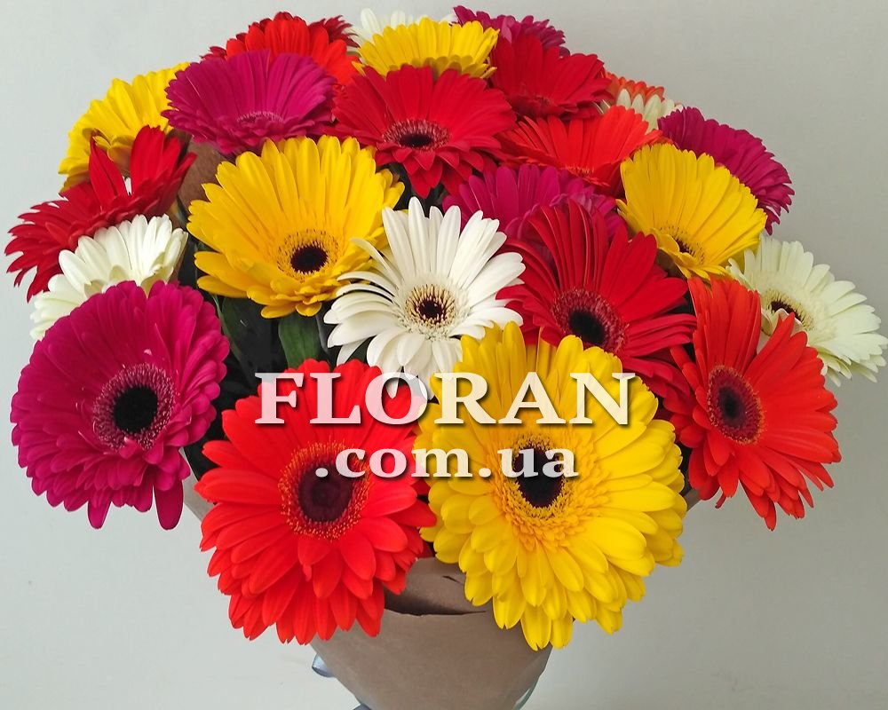 Букет з 25 гербер - код товару FL-375. Цей яскравий і барвистий букет, у якому зібрано 25 різнокольорових гербер, які будуть радувати своєю красою та свіжістю довгий час. Гербери – це квіти, які символізують радість, оптимізм та душевну рівновагу. З герберами можна привітати з днем народження, ювілеєм, весіллям чи просто подарувати на згадку. Букет з 25 гербер різного кольору – це відмінний вибір для тих, хто любить яскраві та насичені кольори. Гербери можуть бути білими, рожевими, червоними, помаранчевими, жовтими і навіть фіолетовими. Кожен колір символізує щось своє, тому можна вибрати той, який найбільше підходить для конкретного випадку. Букет з 25 гербер - це чудовий спосіб висловити свої почуття та побажання близьким людям. Подаруйте цей букет і побачите, як він принесе посмішку на обличчя і зробить день яскравішим і яскравішим.