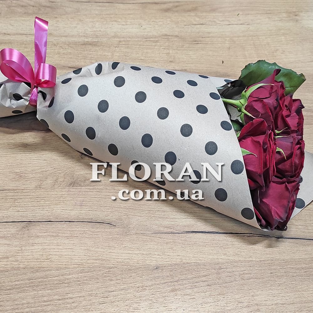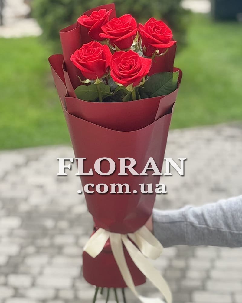 Букет з 5 червоних троянд - код товару FL-64. Цей букет із троянд стане прекрасним подарунком для будь-якого випадку. 5 червоних троянд - це символ пристрасті та любові. Букет з українських троянд - це гарантія свіжості та якості квітів. Червоного кольору троянди завжди були в моді і будуть вічною класикою. Цей букет троянд підійде для будь-якого віку і статі. Він буде прекрасним подарунком для дівчини, дружини, мами чи тата. Червоні троянди - це символ пристрасті і любові, вони говорять про те, що ви цінуєте і любите людину, якій даруєте цей букет. Подаруйте цей букет троянд і ви побачите, як він підніме настрій і наповнить життя яскравими фарбами.