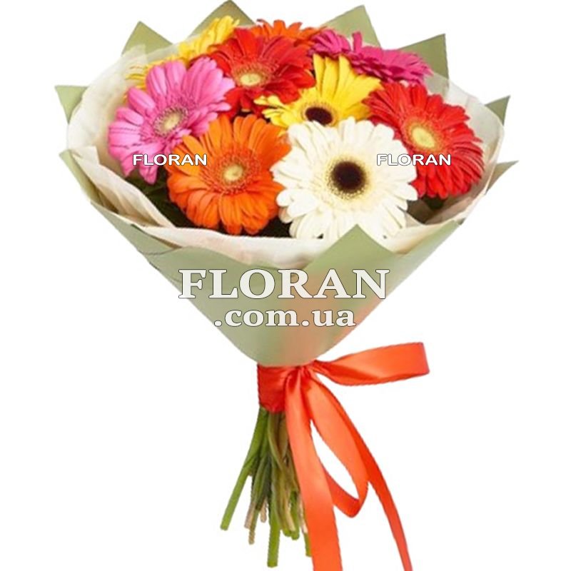 Букет з 9 гербер - код товару FL-380. Круглий букет із 9 різнокольорових гербер може створити яскравий та позитивний настрій у будь-яку пору року. Ці квіти, що нагадують сонце своїми яскравими пелюстками, ідеально підходять для подарунка близькій людині або прикраси будинку. Комбінація різних відтінків гербер, включаючи рожеві, жовті, червоні та помаранчеві, робить цей букет дуже барвистим та життєрадісним. Якщо ви шукаєте невеликий, але ефектний подарунок, цей букет з 9 різнокольорових гербер - відмінний вибір.