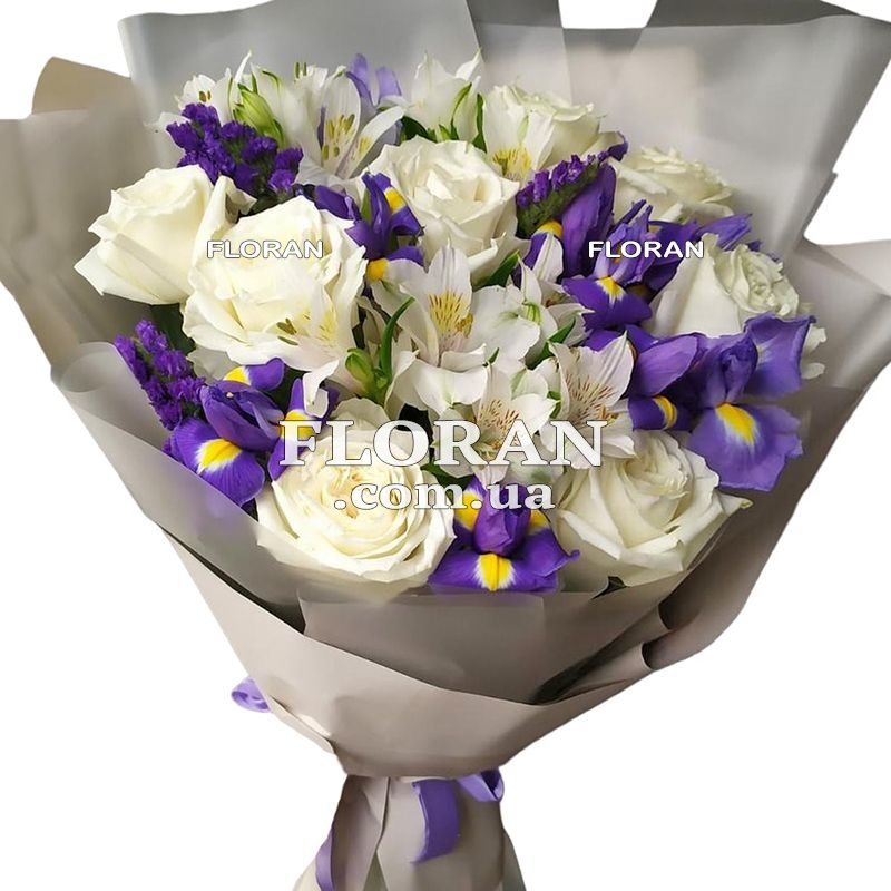 9 білих троянд, 4 білі альстромерії, 10 ірисів, упаковка