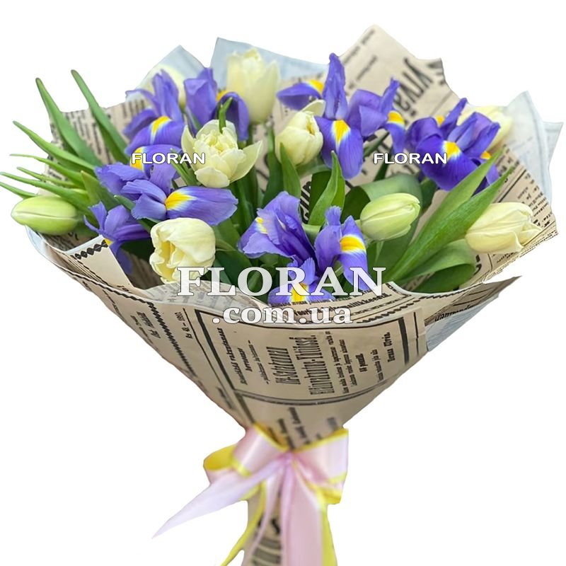 Букет з білими тюльпанами та ірисами