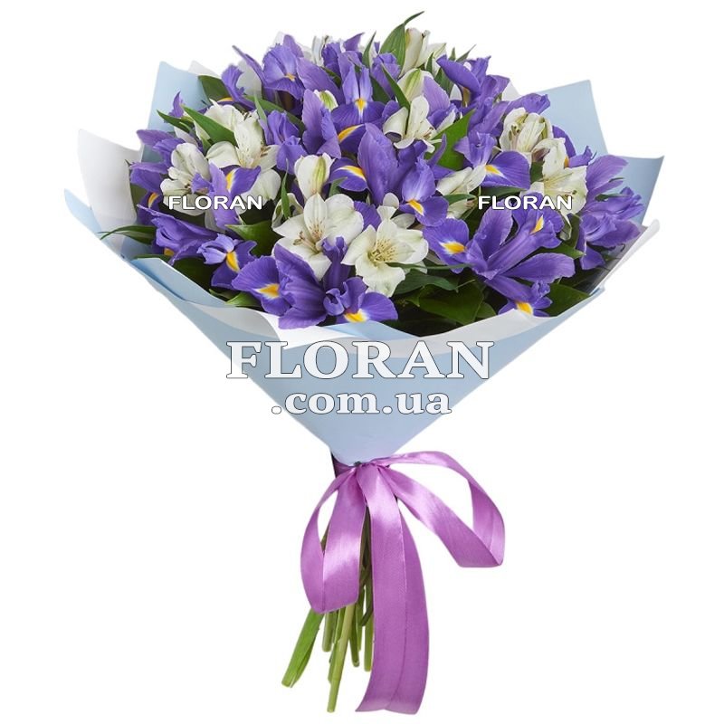 Букет з ірисів та альстромерій - код товару FL-1104. Букет з 15 ірисів і 6 білих альстромерій обіцяє бути яскравим і елегантним. Іриси своїми прекрасними квітами і унікальною формою пелюсток привнесуть в букет неповторність і вишуканість. Вони є символом елегантності, благородства і духовного багатства. Іриси також випромінюють аромат, який додасть романтики в букет. Білі альстромерії, своєю чергою, додадуть ніжності та грації в композицію. Своїми витонченими пелюстками і легкістю внесуть нотку свіжості і чистоти в букет. Альстромерії символізують красу і витонченість, їх присутність доповнить букет з ірисів, створюючи гармонійне поєднання кольорів і форм.