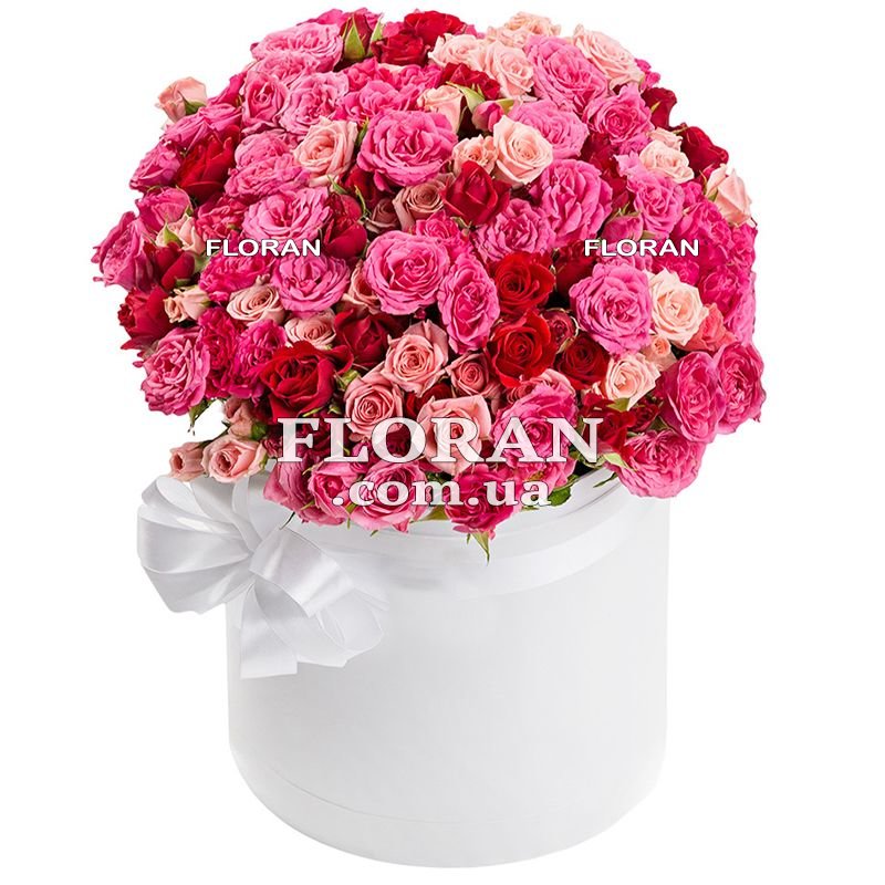 Букет з кущових троянд в коробці - код товару FL-191. Кущові троянди в коробці - це прекрасний спосіб показати свою любов і турботу. Дрібні, яскраві квіти, будуть прекрасним подарунком для будь-якої жінки. Вони порадують око своїм насиченим кольором і приємним ароматом. Цей букет зможе підняти настрій і додати яскравих фарб у повсякденне життя. Він стане символом вашої турботи і любові до близької людини. І нехай ці троянди не є витвором мистецтва, але вони точно зроблять життя яскравішим і красивішим. Цей букет подарує масу позитивних емоцій і залишить незабутні враження на довгі роки. Він ідеально підійде для найромантичніших випадків, таких як день весілля або річниця стосунків. Такий подарунок покаже вашу любов і турботу.