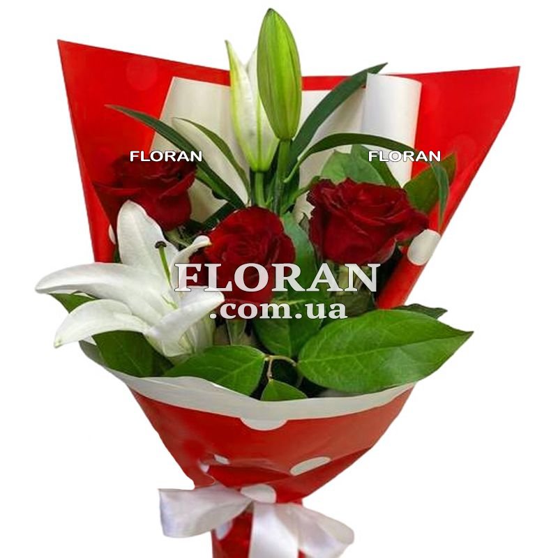 Букет з лілій та троянд - код товару FL-1132. Букет з 1 білої лілії і 4 червоних троянд створить ніжне і романтичне поєднання квітів. Цей мінімалістичний букет привертає увагу своєю простотою і елегантністю. Біла лілія, з її витонченою квіткою і ароматом, є символом чистоти, невинності та свіжості. Вона також асоціюється з благородством і розкішшю. Білий колір лілії часто вибирають для весільних букетів, оскільки він символізує чистоту і новий початок. Червоні троянди, з їхнім яскравим і привабливим відтінком, є символом пристрасті, кохання і романтики. Вони є класичним вибором для вираження глибоких почуттів і емоцій. Червоні троянди також символізують красу і силу.
