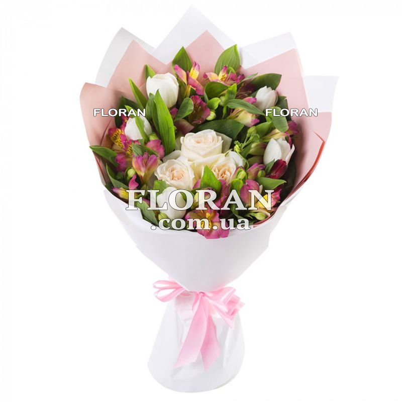 3 білі троянди, 5 білих тюльпанів, 7 рожевих альстромерій, упаковка