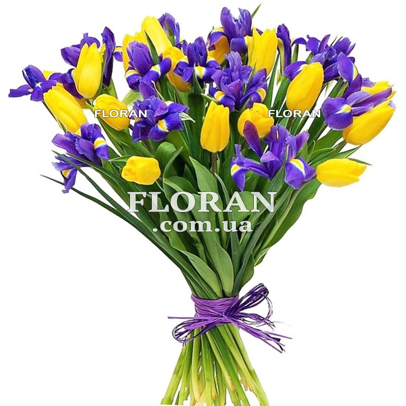 17 жовтих тюльпанів, 14 ірисів, стрічка або упаковка