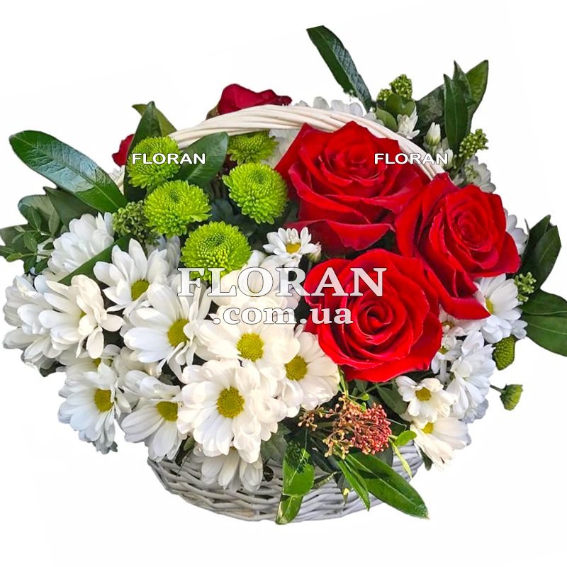 Букет у кошику - код товару FL-624. Гарний та вишуканий букет у кошику, який підходить для будь-якого випадку, включаючи Новий рік. Він складається з 6 червоних троянд, які символізують пристрасть та любов, а також 8 білих хризантем, які уособлюють чистоту та невинність. Три зелені хризантеми додають яскравості та освіжають загальний вигляд композиції. Зелень у букеті надає йому додаткового обсягу і завершує його вигляд. Кошик, в якому представлений букет, створює додаткову атмосферу затишку та дарує радість тому, хто його отримає. Цей букет може бути чудовим подарунком для мами, подруги чи колеги на Новий рік, День народження чи будь-який інший особливий день у житті.