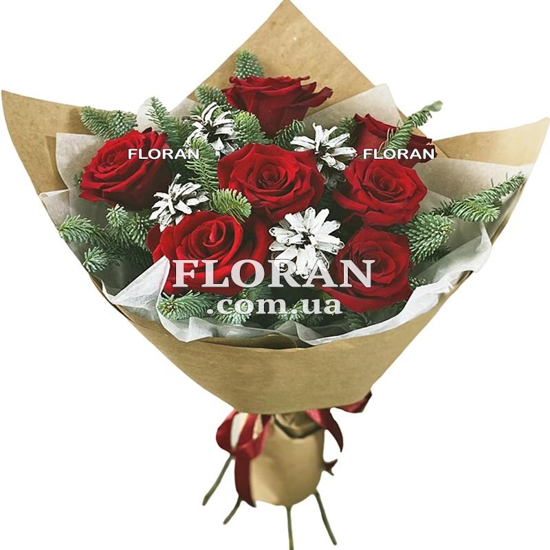 Червоні троянди з шишками в букеті - код товару FL-2233 - це чудовий букет, який поєднує в собі елегантність та зимові мотиви, роблячи його чудовим вибором для подарунка у будь-яку пору року, особливо у зимовий сезон. Сім червоних троянд – це символ пристрасті та кохання. Вони додають у букет яскравість і тепло, а їх насичений червоний колір приковує увагу та наповнює повітря ароматом кохання. Чотири шишки та гілки ялини чи сосни надають букету зимового характеру. Ці елементи нагадують про зимові свята та створюють атмосферу тепла та затишку. Упаковка завершує вигляд цього лаконічного та красивого букета, роблячи його готовим до подарунка. Незалежно від того, кому ви маєте намір його подарувати - стоматологу, лікарю, косметологу або своїй коханій дівчині, червоні троянди з шишками в букеті обов'язково принесуть радість та покращать настрій. Ми із задоволенням організуємо доставку цього зимового букету до будь-якого міста України, щоб зробити ваш подарунок ще більш особливим та незабутнім. Подаруйте красу та атмосферу з цим чудовим букетом.