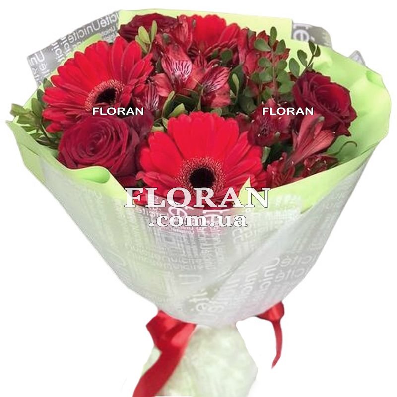 3 червоні гербери, 3 червоні троянди, 3 червоні альстромерії, упаковка