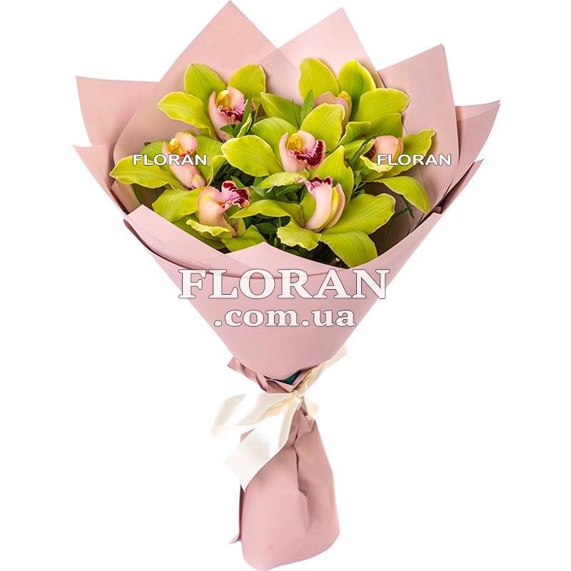 Цимбідіум букет - код товару FL-431. Букет із 7 зелених орхідей цимбідіум - це чудовий подарунок, який підкреслить ваше захоплення та повагу до отримувача. Свіжі та вишукані орхідеї будуть символом вишуканості та стилю, їхнє зелене забарвлення надає особливої привабливості.