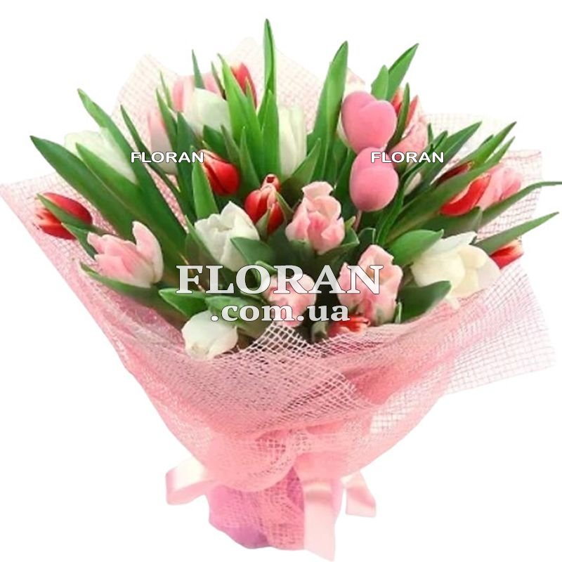 День святого Валентина букет - код товару FL-589. Букет з 25 червоних, білих та рожевих тюльпанів вважається одним із найпопулярніших та найпопулярніших варіантів для подарунка на День святого Валентина. Червоні тюльпани символізують глибоку любов і пристрасть, білі – чистоту та ніжність, а рожеві – освідчення в коханні. Такий букет підкреслить важливість вашого ставлення та покаже, що ви цінуєте свою половинку. У такому букеті поєднуються елегантність та романтика, що робить його універсальним подарунком для будь-якого віку та будь-якої стадії стосунків. Крім того, тюльпани є одним з найпопулярніших весняних квітів, що дарує додатковий символізм - вони піднімуть настрій і принесуть надію на нові починання та можливості. . Тюльпани – це довговічні квіти, які радують своєю красою та ароматом кілька днів. Їх можна укласти у вазу або розкласти по кімнаті, щоб створити затишну та романтичну атмосферу. Букет з 25 тюльпанів з декоративними серцями - це чудовий спосіб показати своє кохання та турботу в цей особливий день.