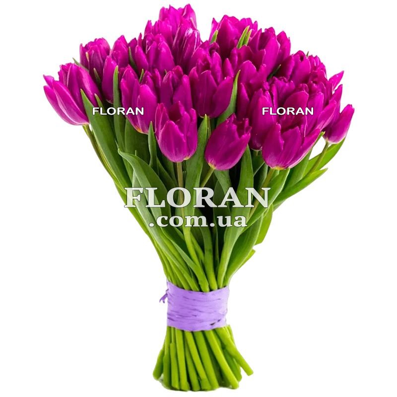 Фіолетові тюльпани під стрічку - код товару FL-2369. Фіолетові тюльпани - це символ загадковості, чарівної привабливості та поваги. Букет з 39 фіолетових тюльпанів, прикрашених стрічкою або красиво упакований, буде чудовим подарунком для особливих людей у вашому житті. Колір фіолетових тюльпанів зазвичай асоціюється з таємничістю та глибокою привабливістю. Він може бути відправлений як вияв поваги та захоплення до когось, так і як знак вдячності. Букет із фіолетових тюльпанів чудово підходить для подарунка у різні моменти: від днів народження до ювілеїв та навіть важливих корпоративних подій. Стрічка або упаковка додадуть додаткову візуальну чарівність до цього букету. Якщо ви бажаєте надіслати цей букет особливої для вас людині, зверніться до нашої служби доставки, і ми зробимо так, щоб ваш подарунок прибув точно вчасно та в ідеальному стані.