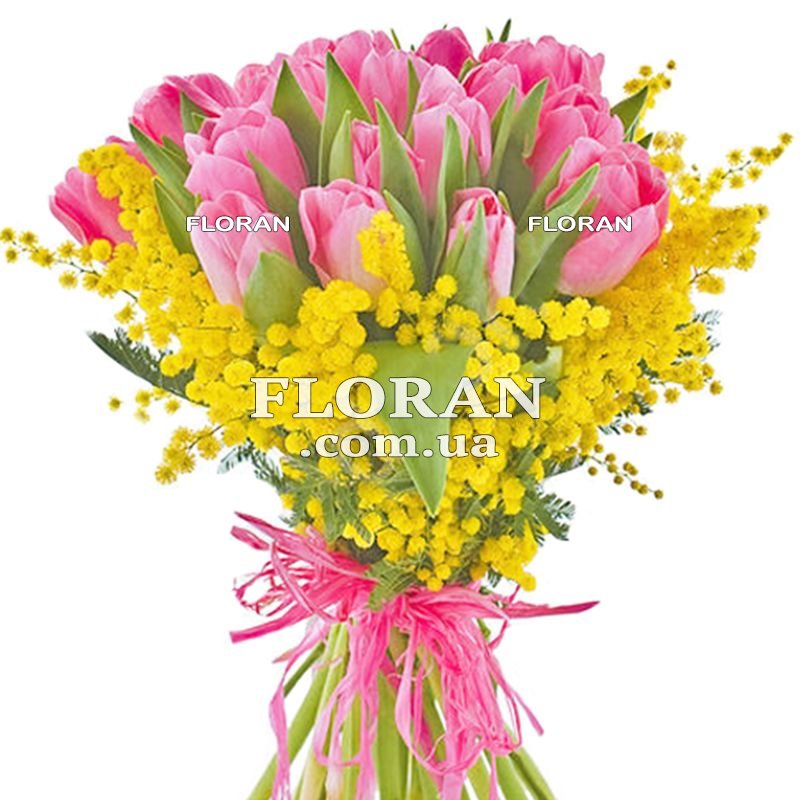 19 рожевих тюльпанів, мімоза, стрічка або упаковка