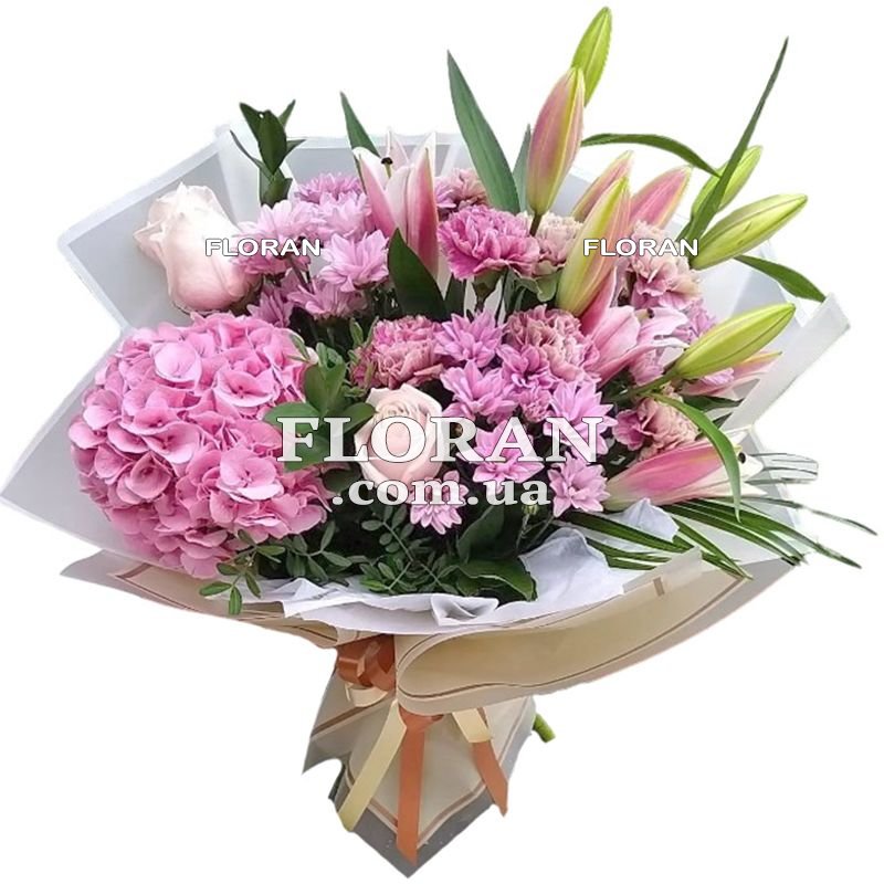- 1 рожева гортензія. Гортензії мають великі суцвіття та чудово доповнюють композицію букета. Рожева гортензія надасть букету об'єму та ніжності.
