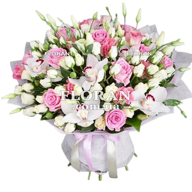 - 15 білих або кремових кущових троянд: кущові троянди є насиченими та пишними квітами, які надають букету об'єм та текстуру. Білі або кремові кущові троянди підкреслять вишуканість та створять гармонійне поєднання з орхідеями та трояндами.