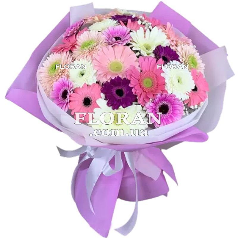 Гербери на Ювілей - код товару FL-1577 - ідеальний вибір для ювілею, особливого свята, яке відзначає значний період життя людини. Ювілей - це особливий привід для урочистостей, і яскравий та барвистий букет із гербер стане чудовим символом радості, святкового настрою та привітань. Різнокольорові гербери у букеті створять враження життєрадісності та свята. Кожен колір герберів символізуватиме своє значення та передаватиме певні емоції. Наприклад, червоні гербери символізуватимуть любов і пристрасть, рожеві – ніжність та доброту, помаранчеві – енергію та оптимізм, жовті – радість та щастя, а також інші кольори можуть додати свій зміст та значення. Упаковка букета також важлива, вона повинна відповідати особливому випадку. Ви можете вибрати стильну та елегантну упаковку, що підходить до урочистого настрою ювілею. Наприклад, ви можете вибрати упаковку в класичних кольорах, таких як білий, фіолетовий або рожевий, щоб наголосити на значущості цього дня. Букет із 25 різнокольорових гербер - це не лише гарний подарунок, а й символ довголіття, процвітання та радості. Він може висловити ваше щире привітання та побажання щастя, здоров'я та благополуччя. Цей букет стане яскравим та незабутнім доповненням до ювілейної урочистості, і його краса та свіжість будуть радувати отримувача довгий час.