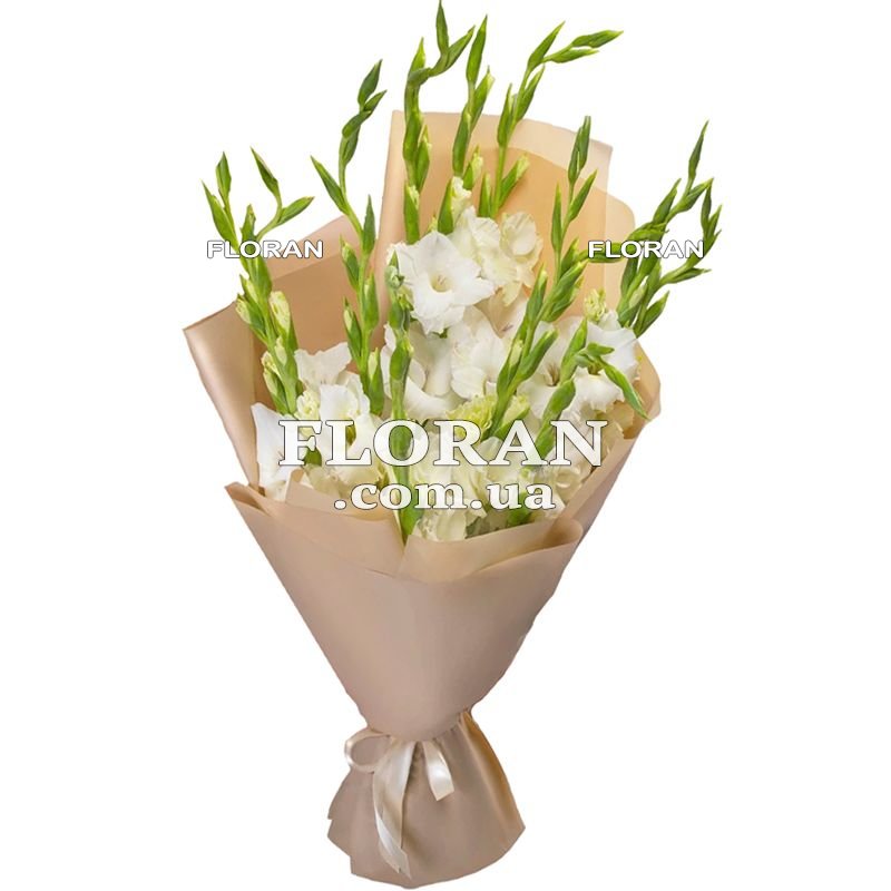 Гладіолуси у букеті - код товару FL-1476. Ваш вибір – елегантні гладіолуси, які чудово підійдуть для створення витонченого букета. У букеті міститься 11 білих гладіолусів, які додадуть йому свіжого та стильного вигляду. Гладіолуси - це квіти з довгими, стрункими стеблами та прекрасними квітками, розташованими по всій їхній довжині. Білі гладіолуси символізують чистоту, ніжність та непорочність. Вони є ідеальним вибором для створення романтичного та вишуканого букета. Букет з 11 білих гладіолусів буде чудовим подарунком для особливих випадків, таких як весілля, ювілей чи різдво. Він підкреслить важливість моменту і додасть нотку витонченості і краси. Цей букет також буде чудовою прикрасою інтер'єру або столу на будь-яке свято. Не пропустіть можливість придбати цей витончений букет з 11 білих гладіолусів і порадувати своїх близьких чи коханих людей. Його чудова комбінація витонченості та свіжості зробить його незабутнім символом ваших найтепліших побажань та емоцій.