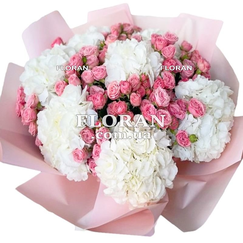 7 білих гортензій, 30 рожевих троянд, упаковка