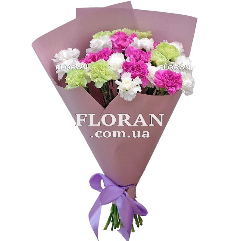 Гвоздики у букеті - код товару FL-1681. Бажаєте порадувати близьких людей красою? Тоді зверніть увагу на гвоздики – квіти, які мають багато значень. Гвоздики символізують любов, довіру, вдячність та пристрасть. Вони чудово підходять для того, щоб висловити свої почуття та визнання не лише своїй другій половинці. Гвоздика має величезну позитивну енергію і не так часто зустрічається в Україні, що дозволяє приємно здивувати одержувача цією неймовірно красивою композицією. Ажурні пелюстки, легкий деревний аромат та неповторна різноманітність забарвлень дозволяють створювати справжні квіткові шедеври, які викликають захоплення. Гвоздики прикрашали вази палаців упродовж багатьох століть, а сьогодні вони використовуються для створення чудових букетів на найрізноманітніші події: дні народження, ювілеї, весілля, а також як декор на корпоративних урочистостях. Ви завжди можете замовити гвоздики у букеті у нашому інтернет-магазині Floran. Ми створимо розкішну композицію та забезпечимо оперативну кур'єрську доставку.