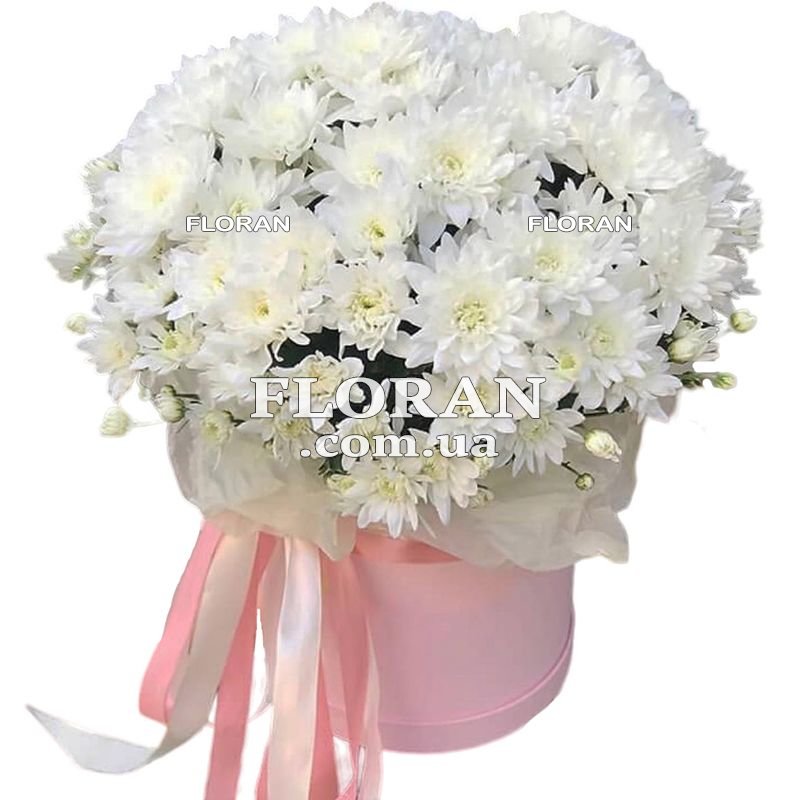 Хризантеми в капелюшній коробці - код товару FL-2951 - це не просто квіти, це джерело захоплення та свіжості, яке можна подарувати собі або близькій людині. Наші флористи створили дивовижну композицію, використовуючи 19 білих хризантем, щоб принести до вашої оселі яскраві моменти радості та затишку. Капелюшна коробка додає особливого шарму та елегантності цієї композиції. Вона не тільки служить незвичайним контейнером, а й стає частиною оригінального дизайну букета, що надає йому витонченості та стилю. Наша служба доставки коробок з квітами надає можливість зробити ваші свята та події ще більш особливими. Ми гарантуємо, що кожен букет хризантем дійде до вас або вашого близького в безпеці, зберігаючи свою свіжість і красу. Вибираючи композицію Хризантеми в капелюшній коробці, ви вибираєте не просто квіти, а яскраве втілення радості і тепла, що запам'ятовується.