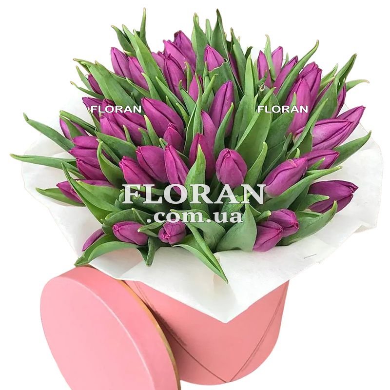 Капелюшна коробка з фіолетовими тюльпанами - код товару FL-2882 - це надзвичайно елегантний та вишуканий подарунок. Фіолетовий колір символізує розкіш, таємницю та вишуканість, що робить цей букет ідеальним для особливих випадків та для тих, хто цінує тонкий смак. Така коробка з тюльпанами подарує не лише красу квітів, та й неповторний аромат весни. Фіолетові тюльпани також асоціюються із загадковістю і величністю, що робить їх відмінним вибором для подарунка тим, хто заслуговує на особливу увагу. Наші кур'єри із задоволенням доставлять цей розкішний букет прямо до рук вашого одержувача. Такий подарунок підкреслить ваші почуття, додасть родзинку в особливий момент і принесе радість та захоплення. Нехай цей букет стане яскравим символом вашого захоплення та турботи!