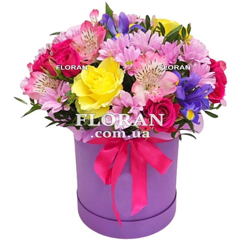 3 жовті троянди, 2 рожеві кущові троянди, 3 рожеві альстромерії, 3 рожеві альстромерії, 2 іриси, коробка
