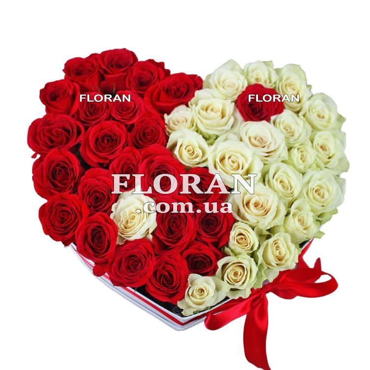 Композиція з квітів серце - код товару FL-263. Ця красива композиція з троянд у формі серця стане прекрасним подарунком для коханої людини. Серце з квітів - це символ любові і ніжності, який ніколи не вийде з моди. У цій композиції використовується 45 червоних і білих троянд, які створюють яскравий контраст і привертають увагу. Троянди - це класичний вибір для подарунка, і композиція з троянд - це завжди гарний вибір.