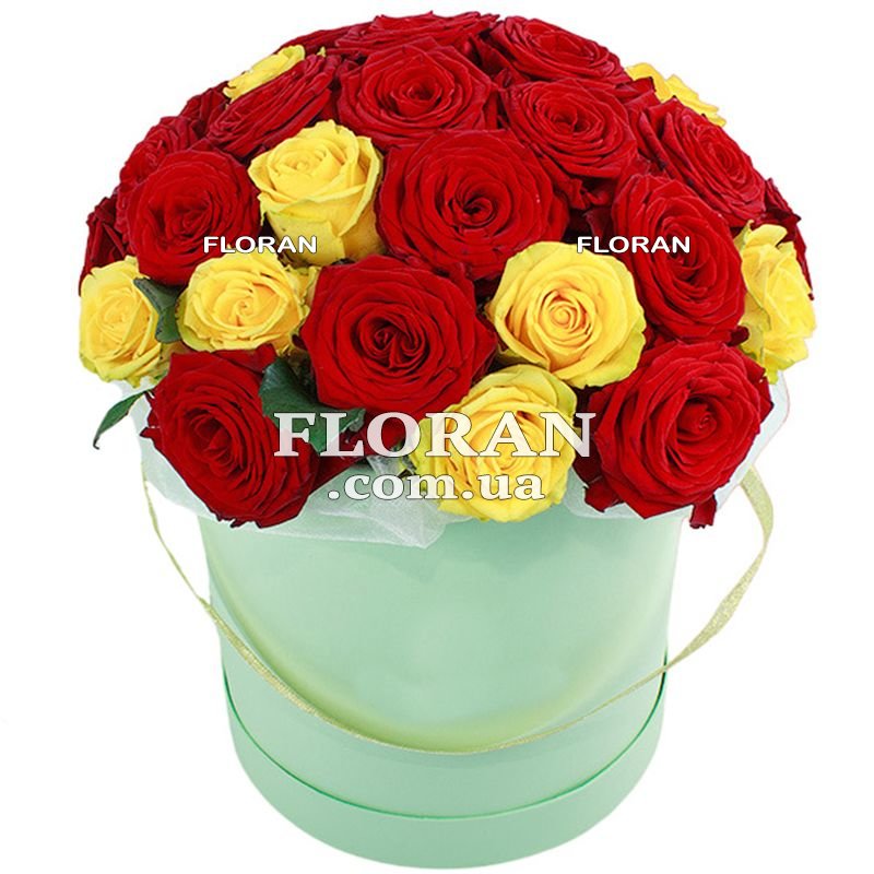 Контастна коробка з трояндами - код товару FL-1795 - це справжня гра контрастів та яскравості. Червоні троянди символізують пристрасть та силу почуттів, тоді як жовті троянди виражають радість, щастя та дружню прихильність. Цей чудовий букет підходить для різних особливих випадків та свят. Він може бути ідеальним подарунком для вашої коханої людини, щоб висловити йому своє глибоке кохання і пристрасть. Також він може стати чудовим подарунком для друга або близької людини, щоб поділитися радістю та веселощами. Коробка, в якій представлені ці контрастні троянди, надає композиції особливої елегантності та стилю. Вона захищає та підкреслює красу кожної квітки, створюючи привабливе та вишукане поєднання. Отримувач буде приємно здивований та захоплений цим яскравим та неповторним подарунком. Наша доставка квітів гарантує, що цей чудовий букет буде доставлений у потрібний час та місце. Ми пропонуємо гнучкі умови доставки, щоб задовольнити усі ваші потреби. Незалежно від того, де знаходиться ваш одержувач – у місті чи за його межами, наша команда кур'єрів доставить букет туди, куди ви забажаєте. Не пропустіть можливість порадувати своїх близьких або близьких людей цією чудовою контрастною композицією з червоних і жовтих троянд у коробці. Цей букет стане яскравим та незабутнім символом ваших емоцій та побажань.