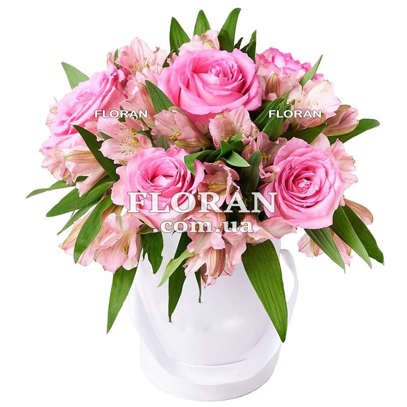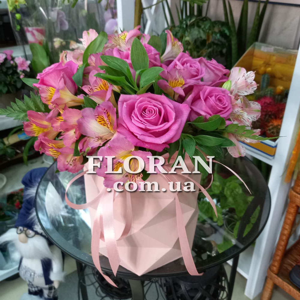 Коробка квітів у рожевих тонах - код товару FL-2963 - це вишукана композиція, що втілює ніжність і чуттєвість рожевих відтінків. П'ять рожевих троянд та шість рожевих альстромерій створюють неповторний букет, наповнений весняною чарівністю. Рожеві троянди, класичний символ любові та ніжності, надають композиції романтичного відтінку. Альстромерії, у свою чергу, додають букету легкості та грайливості. Рожевий колір альстромерій асоціюється з ніжністю та жіночністю, що робить цей букет чудовим подарунком для вираження захоплення та захоплення. Коробка квітів у рожевих тонах - ідеальний варіант для подарунка вашим близьким чи коханим у будь-який особливий момент. Наші кур'єри забезпечать надійну доставку цієї чудової композиції, щоб наголосити на важливості вашої уваги та турботи.