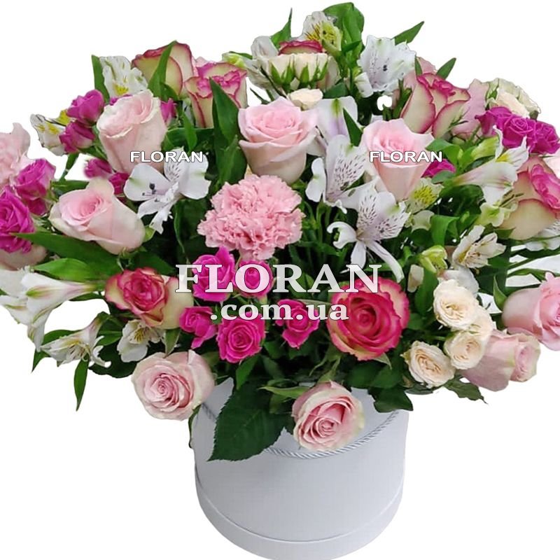 20 рожевих троянд, 8 кремових та рожевих кущових троянд, 3 рожеві гвоздики, 6 білих альстромерій, коробка
