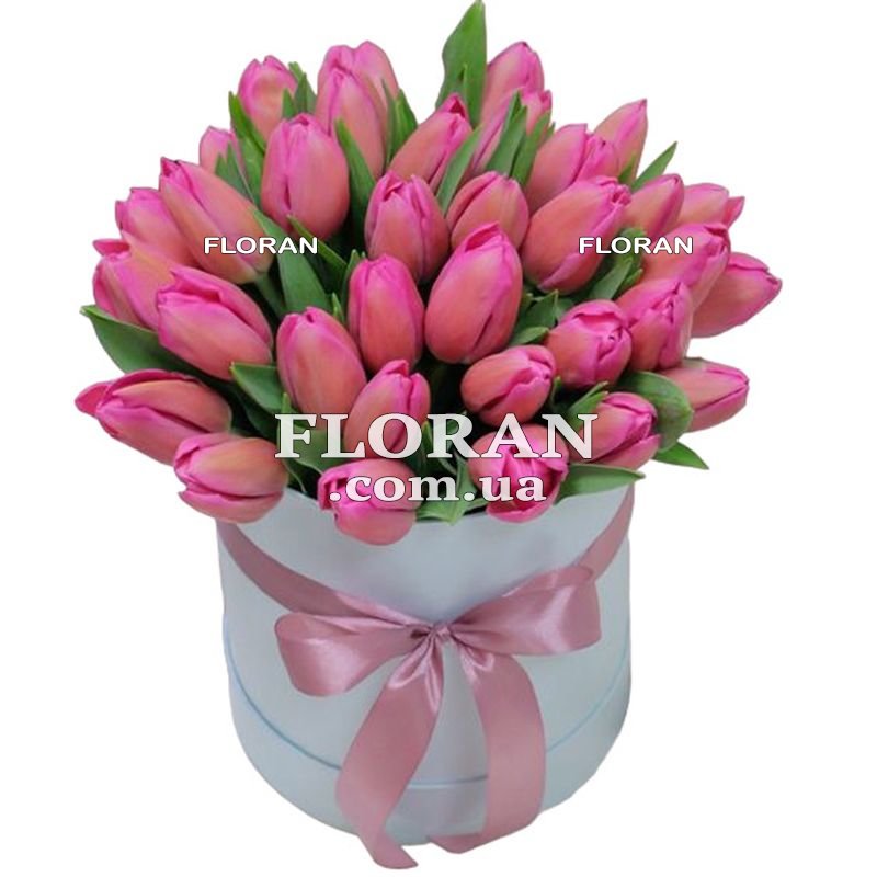 Коробка з рожевими тюльпанами – код товару FL-2848. У затишному куточку будинку, де панує весняне повітря та світло, з'явилася коробка, наповнена 37 рожевими тюльпанами. Вона прийшла як послання ніжності та захоплення від таємничого відправника. Квіти, наче охоронці весняного дива, принесли із собою не тільки свіжість весни, а й неймовірне почуття радості та умиротворення. Кожен бутон, як жива мить чарівництва, розповідає свою унікальну історію про кохання та турботу. Рожеві тюльпани, уособлюючи ніжність та тепло, створюють навколо себе атмосферу захоплення. Ця коробка - як чарівна скринька, що сховала в собі найтрепетніші почуття. Дівчина, відкривши коробку, знаходить у ній не лише квіти, а й краплю щастя. Рожеві пелюстки, наче маленькі послання, розповідають про увагу та турботу. Цей подарунок стає магічним моментом, що перетворює буденність вечора на щось особливе. З кожним тюльпаном дарувальник висловлює свою любов та благословення. Ці квіти стають мостом між серцями, немов мова, якою говорять найтрепетніші почуття. І навіть якщо джерело цього подарунку залишається загадкою, його вплив на атмосферу в будинку та серце дівчини залишається незаперечним.
