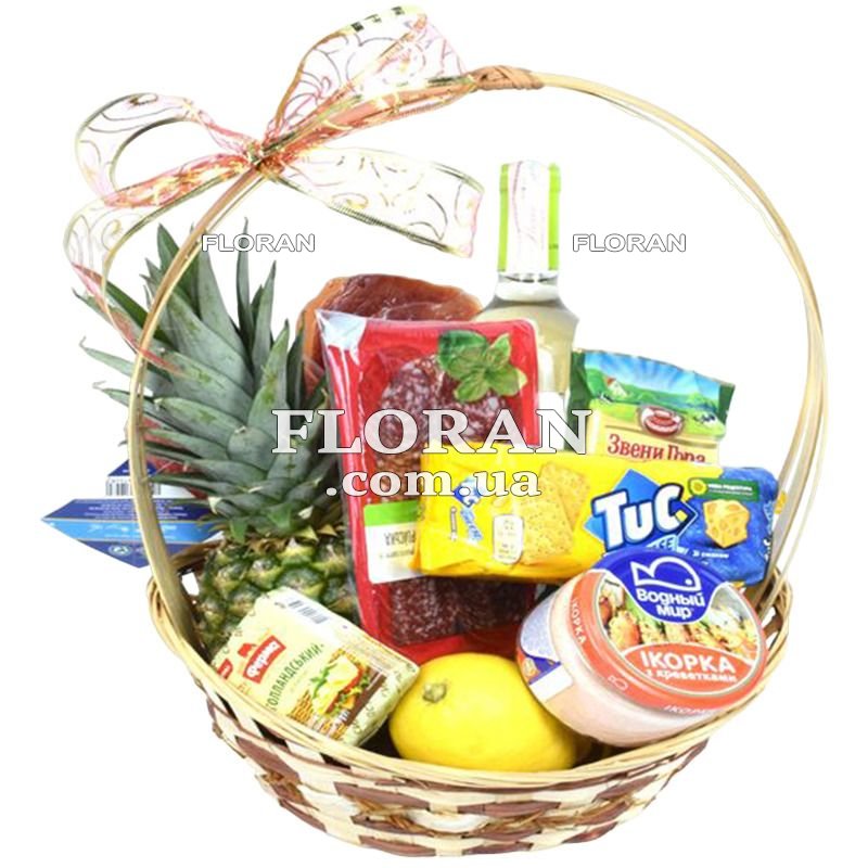 ананас, сир твердий - 1 шт., паста рибна ікорка 160-180 г - 1 шт., ковбасна нарізка 60-80 г, крекери 100-200 г - 1 шт., упаковка чаю в пакетиках - 1 шт., 1 лимон, м'ясна нарізка - 1 шт., вино біле імпортне (у подарунок)