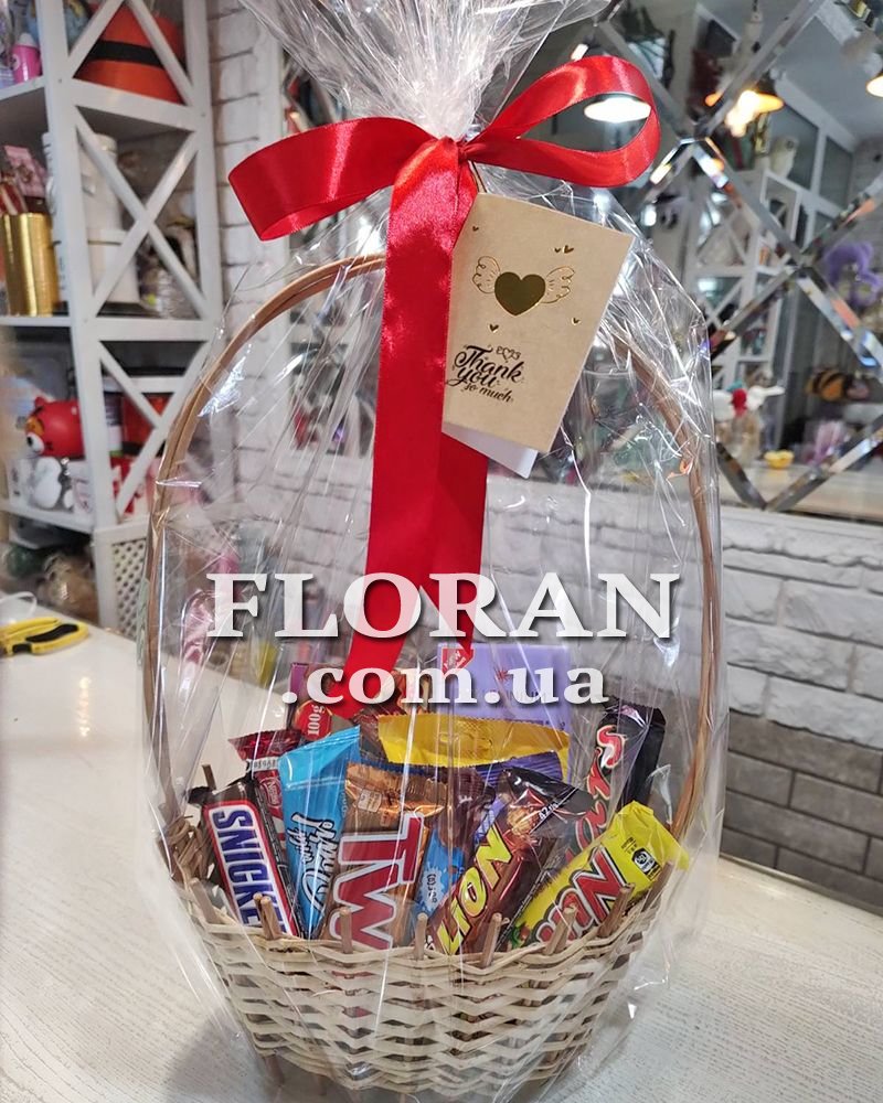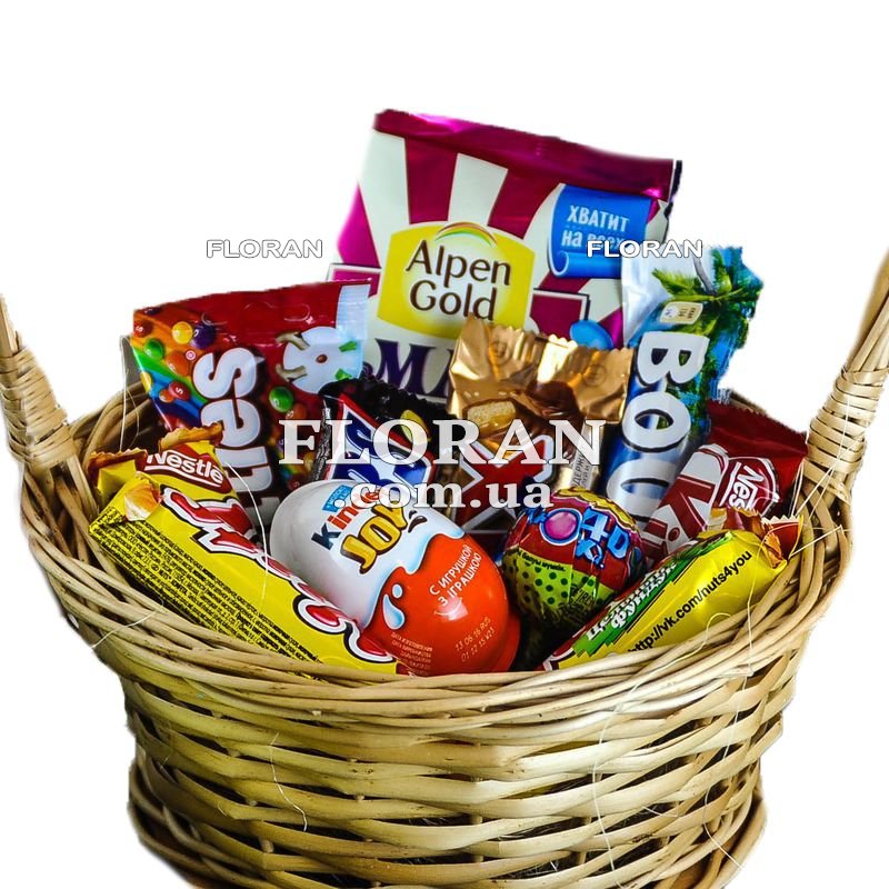 Кошик із солодощами - код товару FL-473. Цей подарунковий кошик стане чудовим подарунком для будь-якої дівчини. У ній зібрані 8 різних батончиків, яйце кіндер, плитка шоколаду 85 г, драже, льодяник на паличці та багато іншого. Кошик шоколаду – це справжній рай для любителів солодощів. Всі ласощі упаковані в гарний кошик, який стане чудовим доповненням до будь-якого подарунка. Подаруйте цей кошик із солодощами своїй коханій дівчині і вона обов'язково оцінить вашу турботу та увагу.