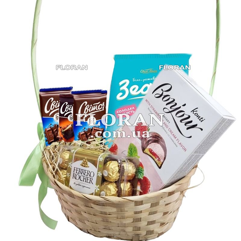 Кошик солодощів на свято - код товару FL-2061. У цьому чарівному кошику зібрані справжні солодкі скарби, які перетворять будь-яке свято на незабутню подію! Почнемо з цукерок Ferrero Rocher - це справжня класика, яка підкорює своїм ніжним смаком і хрумкою начинкою. Їхня гладка шоколадна оболонка просто тане в роті, залишаючи після себе незабутній смак. Зефір у цьому кошику надасть святковому настрою легкість та легкість. Цей м'який та ароматний десерт із ніжною ванільною ноткою точно сподобається всім гостям. Десерт Бонжур - це справжній кулінарний шедевр, який поєднує в собі ніжний мус, хрумку глазур та легкий бісквіт. Цей десерт принесе радість і задоволення кожному, хто спробує його чаклунство. І нарешті, плитки шоколаду, які додадуть нотку гіркої насолоди до вашого свята. Цей шоколад має неповторний смак і аромат, який зробить ваше свято по-справжньому особливим. З цим кошиком солодощів ви зможете пригостити своїх гостей на будь-якій урочистості та подарувати їм незабутні моменти смаку та радості. Легко оформіть замовлення на нашому сайті або через месенджери і наші кур'єри доставлять цей солодкий подарунок прямо до вас на свято. Подаруйте щастя та солодкі миті з цим чудовим кошиком солодощів!