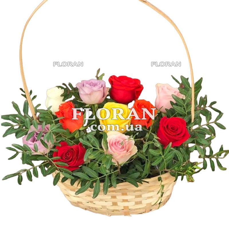 Корзинка троянд - код товару FL-639. Кошик з троянд – це чудовий подарунок для будь-якого випадку. У ній зібрано 11 різнокольорових троянд, які символізують любов, повагу та подяку. Різнокольорові троянди – це відмінний вибір для тих, хто хоче висловити свої почуття яскраво та незвично. Кожен колір троянди має свій сенс, і разом вони створюють неповторну атмосферу. Кошик троянд – це чудовий спосіб привітати близьких та друзів з днем народження, ювілеєм чи просто підняти настрій. Різнокольорові троянди у кошику – це унікальний подарунок, який залишить яскраві спогади на довгі роки. Подаруйте своїм близьким та друзям незабутні емоції за допомогою кошика троянд.