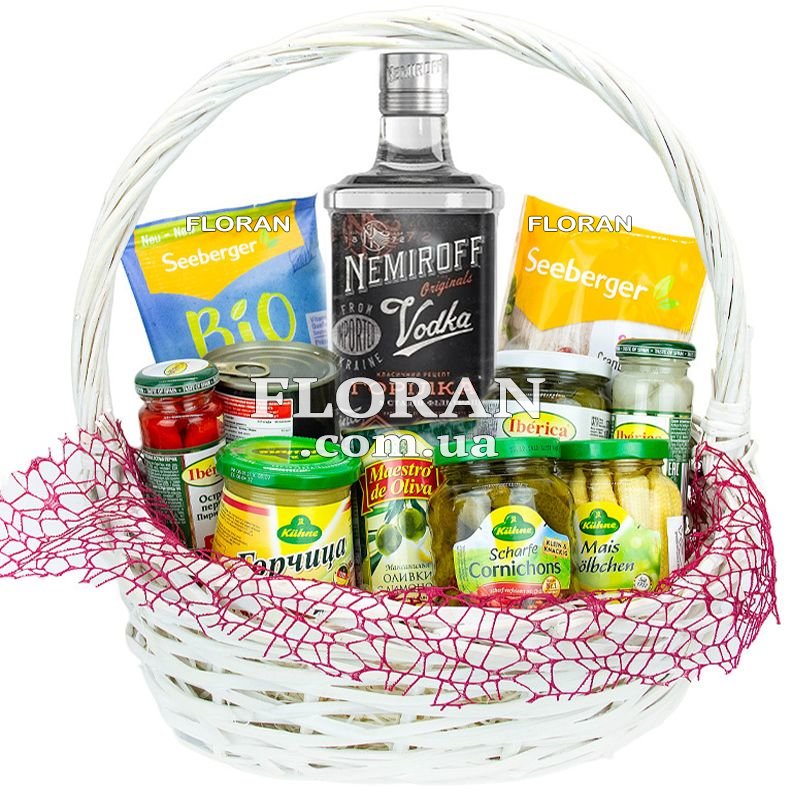 Кошик з горілкою - код товару - FL-1940 - унікальний подарунок для чоловіка, який містить різноманітні делікатеси і, звичайно ж, пляшку відмінної горілки. У цьому кошику ви знайдете різноманітні смаколики - ікру кабачкову, мариновані огірки, консервований горошок, кукурудзу та квасолю в соусі, а також апетитні оливки та маслини, які відмінно поєднуються з алкоголем. Щоб доповнити смачне частування, у кошику є гірчиця, яка додасть яскравих ноток до страв. Сухарики стануть ідеальним супроводом для закуски з горілкою. А найголовніше - у кошику присутня пляшка якісної горілки, яка обов'язково сподобається справжньому поціновувачу цього напою. Цей кошик з горілкою - чудовий подарунок для чоловіка на будь-яке свято чи особливий випадок. Вона обіцяє незабутні смакові відчуття та радість від частування. І пам'ятайте, ми надаємо послугу доставки кошика з горілкою до будь-якого міста України, щоб ви могли порадувати вашого чоловіка незалежно від відстані. Довірте нам турботу про доставку подарунка, і він точно дійде вчасно та в ідеальному стані. Подаруйте вашому чоловікові незабутній вечір із цим унікальним кошиком з горілкою - частування, яке запам'ятається надовго!