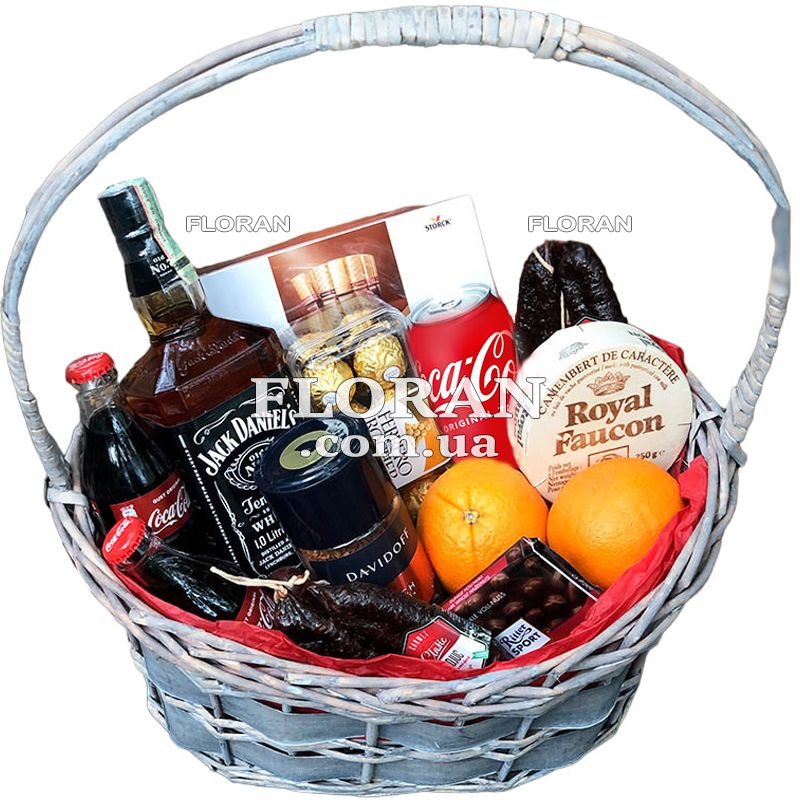 Кошик з віскі - код товару FL-1933. Представляємо вам розкішний кошик з віскі, який стане чудовим подарунком для чоловіка в будь-якому особливому випадку. У цій вишуканій композиції ви знайдете цукерки Mersi та Ferrero Rocher, які додадуть солодких нот у ваше свято. Відмінне віскі Jack Daniels 0,7 л порадує поціновувачів якісних алкогольних напоїв. Кошик також включає каву Lavazza, яка подарує приємні ранкові моменти та зарядить енергією на весь день. Ніжний м'який сир Камамбер або інший чудово доповнить асортимент делікатесів. До складу кошика також входять різноманітні смаколики, такі як суджук, палиця ковбаси салямі, плитка шоколаду та свіжі апельсини. Ми раді запропонувати Вам зручну послугу доставки подарункових кошиків для чоловіків до міста по всій Україні. Незалежно від того, де знаходиться ваш одержувач, ми забезпечимо доставку з любов'ю та увагою, щоб ваш подарунок став приємним сюрпризом та запам'ятався надовго. Довірте нам доставку, і ваш подарунок з віскі та смаколиками точно доповнить особливий день вашого чоловіка.