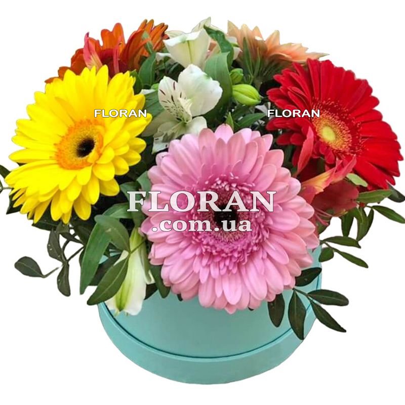 5 різнокольорових гербер, 4 різнокольорові альстромерії, коробка