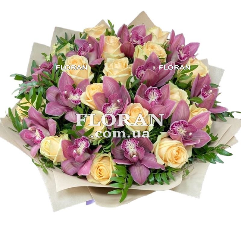 - 18 кремових троянд: кремові троянди символізують чистоту, ніжність та гармонію. Вони додадуть романтики та елегантності у букет. Кремовий колір троянди відмінно поєднується з орхідеями та створить чудовий контраст у композиції.