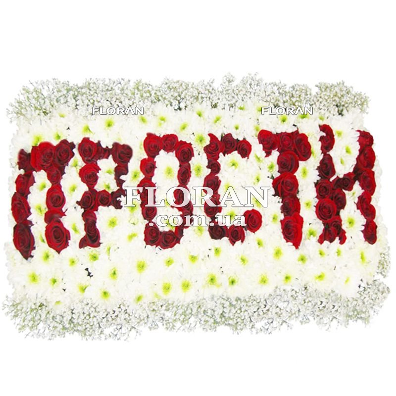 Квітковий напис - код товару FL-284. У складі цього букета 61 червона троянда, біла хризантема, гіпсофіла і флористична основа. Білі хризантеми, що прикрашають цей букет, символізують чистоту і невинність. А викладене з червоних троянд слово Пробач надає йому особливої глибини і значущості. Ці квіти здатні передати найщиріші почуття і допомогти відновити стосунки. Вони висловлять слова, які так важко сказати вголос. Найкращий подарунок для тих, хто хоче повернути довіру і проявити щирість. Краса та вишуканість цього букета вразять навіть найвибагливіших поціновувачів квітів.
